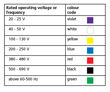 When the operating voltage is indicated colour codes in addition to the specified labels, the colour code given in the table below should be used: