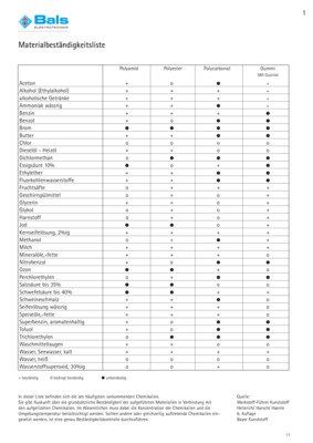 In dieser Liste befinden sich die am häufigsten vorkommenden Chemikalien. Sie gibt Auskunft über die grundsätzliche Beständigkeit der aufgeführten Materialien in Verbindung mit den aufgelisteten Chemikalien.